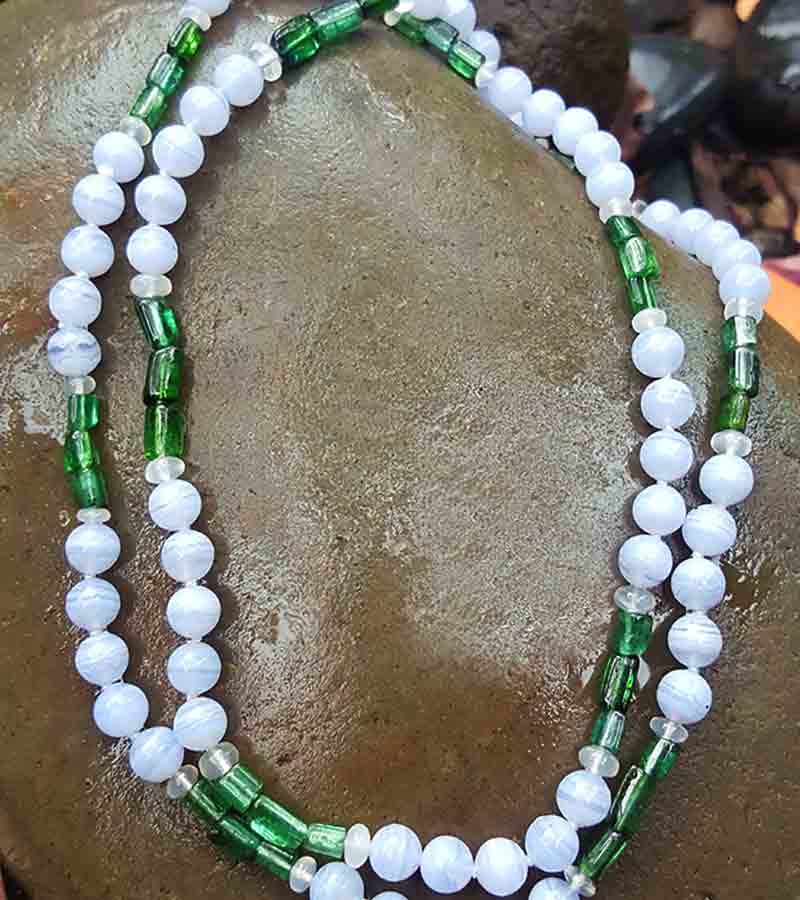 Next to quality, the most important factor in determining a gemstone’s therapeutic power is mass. Quality being equal, larger gems (8 mm or 10 mm) are more potent than smaller ones (4 mm or 6 mm), because they have more mass. If your neck is sensitive to weight, consider wearing necklaces with smaller gems.