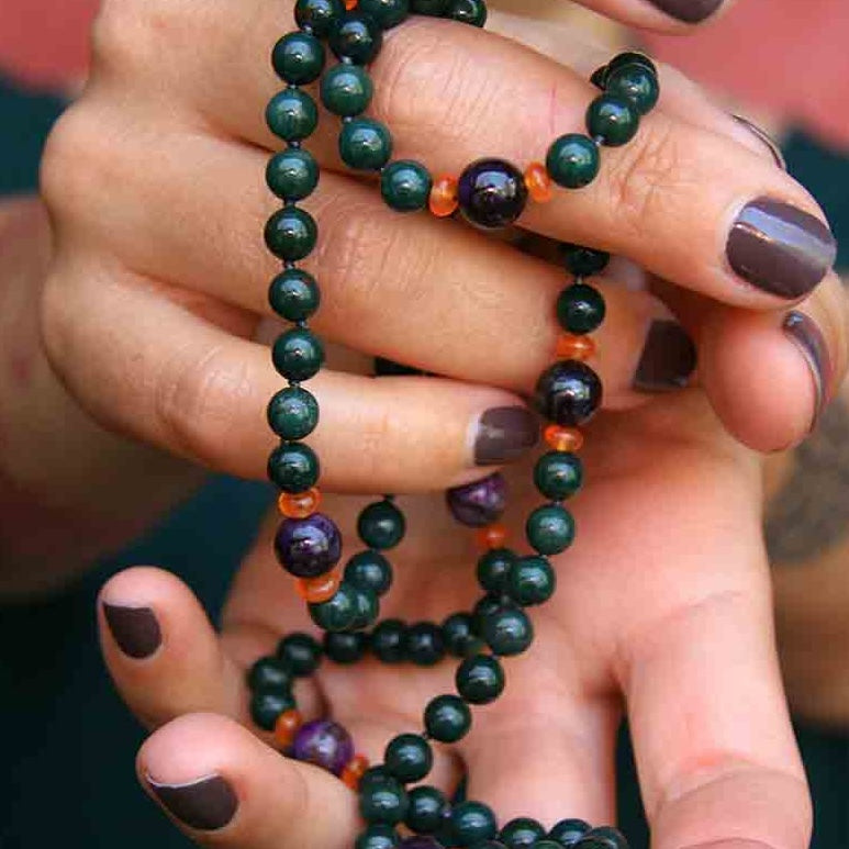 We categorize and match compatible gems to create necklaces, bracelets, and tools with harmonious energy signatures, stringing them on supportive material and knotting between each gemstone for added strength.